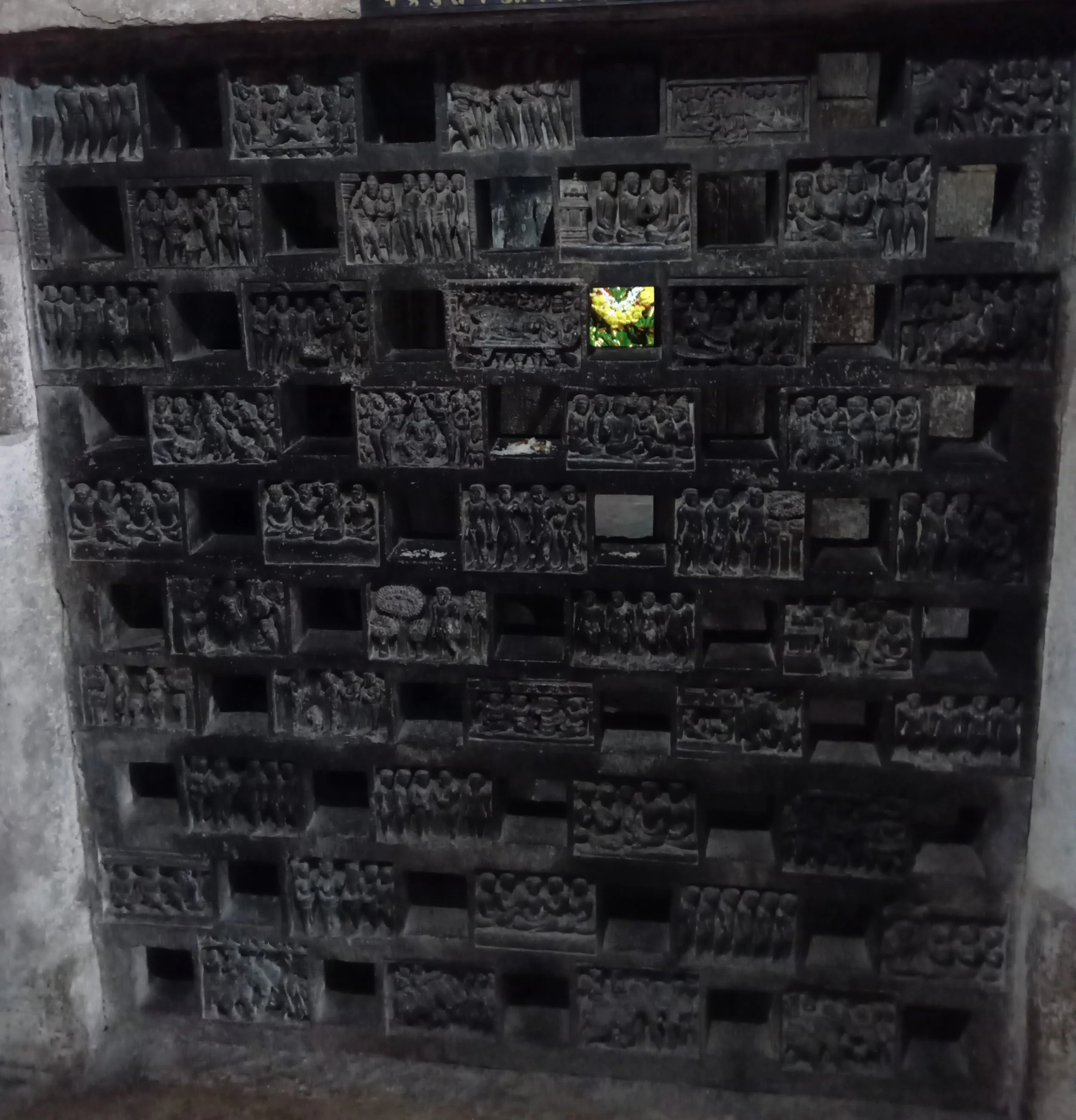 And notably in neighboring Chandragupta basadi, either side of a Parshwanatha shrine two lovely latticework windows with carvings: housing Padmavathi and Kushmandini inside.